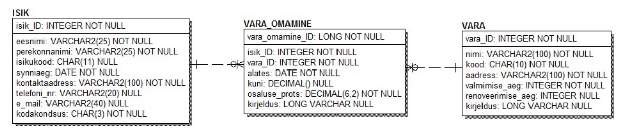 Siin joonisel on näidatud olemite atribuudid. Atribuut on olemi kirjelduse madalaim tase, mille kogum kirjeldab olemi struktuuri. Siin joonisel on ka näha, et kõikidele atribuutidele on lisatud andmetüübid, pikkused ja NULL/NOT NULL piirang, mis määrab, kas antud atribuut võib olla mõnes kirjes tühi (NULL) või mitte (NOT NULL).